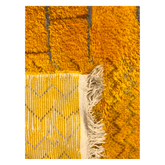 Introducing Midas, a stunning modern Mrirt style Beni Ourain rug that showcases the remarkable craftsmanship of Moroccan artisans. The rug features a captivating design with a vibrant golden yellow base, accentuated by intricate grey and brown linework. The combination of colors and patterns creates a visually striking and eclectic aesthetic. With a plush pile height of 1" and dense knots, this rug exemplifies exceptional durability and high quality. It seamlessly blends a contemporary design approach with the timeless artistry of Moroccan rugs.